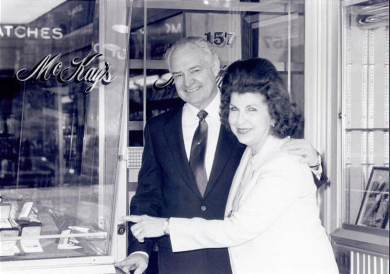There's no such frenetic change inside McKay Diamonds, where the shopkeeper himself looks much as he did when he and his wife, Frances Ellen, made the one-block move from an even smaller location in 1952. Jewels and gems line the display cases on either side of an aisle the width of the door, below a wall of photos of young couples who bought engagement rings here.