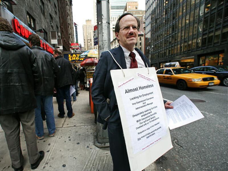 NEW YORK — When laid-off toy company executive Paul Nawrocki hit the streets of Manhattan wearing a sandwich board and handing out his resume, he became the face of the recession.