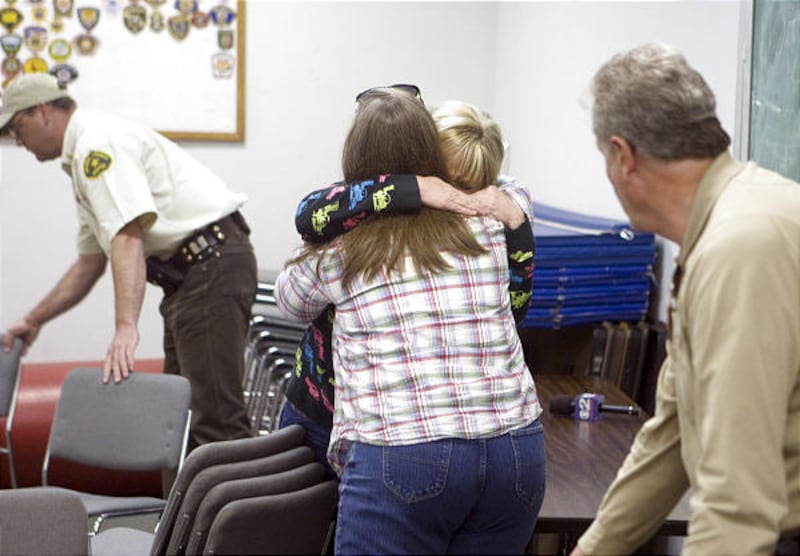In Richfield, flags were at half staff, and police displayed black bands over their badges as they and the entire town mourned Aguilar. At the Sevier County Sheriff's Office, Barney held a private meeting with his deputies, corrections officer and other co-workers, many of them carrying boxes of tissues as they walked into the meeting room, greeting each other with long embraces.