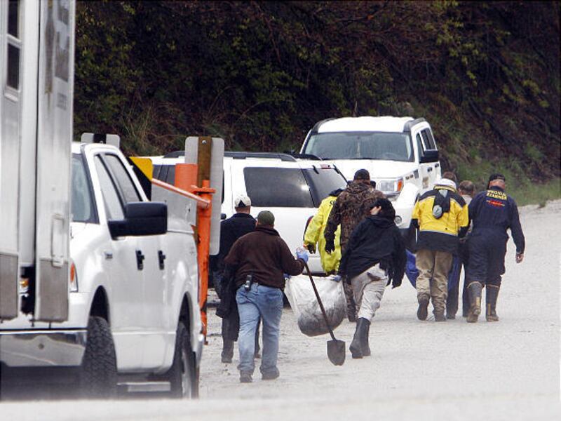 Investigators wearing yellow raincoats and carrying evidence bags and shovels focused on the specific area Tuesday afternoon.