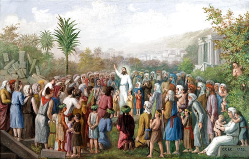 "Resurrected Christ in North America" is a "very charming" rendition of Christ speaking to a New World crowd that includes families with young children and several naked babies.