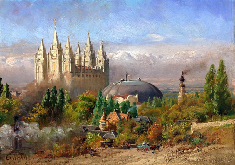 "Mormonen-tempel" is a crisply done oil painting of late 19th century Salt Lake.