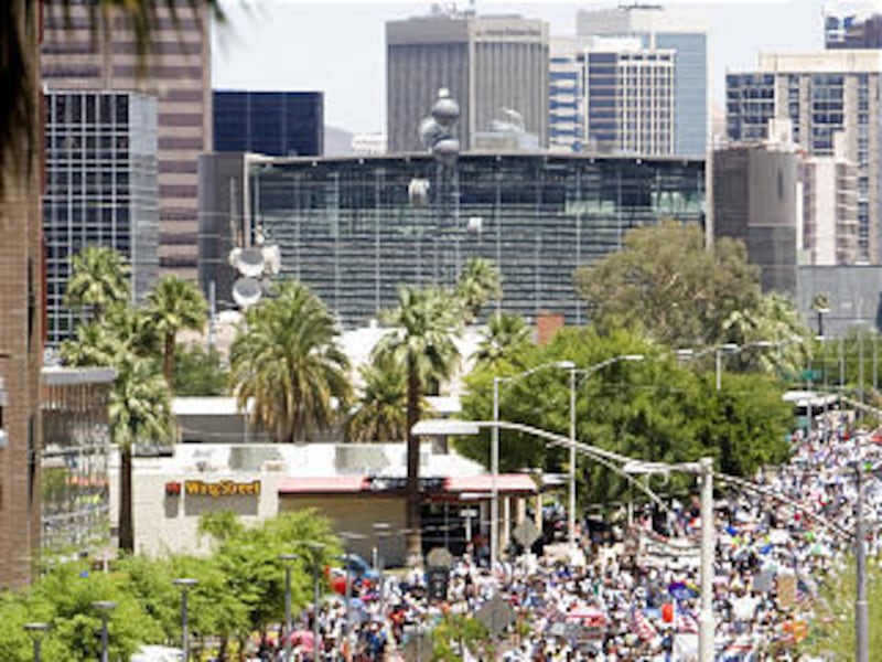PHOENIX — Thousands of people from around the country descended on the Phoenix area Saturday as supporters and opponents of Arizona's tough new crackdown on illegal immigration held separate rallies.