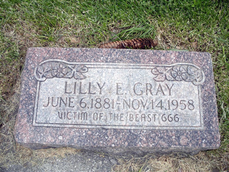 Undoubtedly, the strangest headstone inscription has to be "Victim of the beast 666." Lilly E. Gray died on Nov. 14, 1968, at the age of 77. Her headstone has become legend on the Internet, with more than 2,000 sites now speculating on the "why" behind that devilish reference to the Book of Revelation in the Bible.