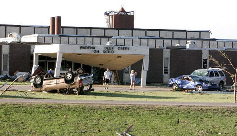 The town pool was destroyed, the high school was badly damaged and a school bus yard was left with buses flipped and shredded.