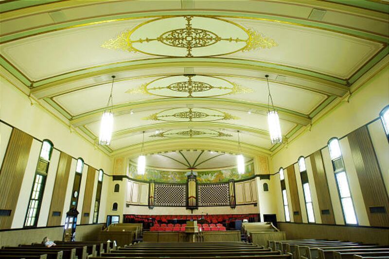 The Granite Stake Tabernacle contains elements you would find in almost any modern LDS meetinghouse: plastic chairs, floral couches and accordion-style room dividers. What gives the building its charm, however, is the synthesis of modern amenities and original architectural elements.