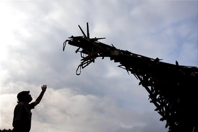 Last month, he decided to turn a pile of broken wooden planks and other detritus on the edge of his property into something more. Boland says was the idea was to build a sculpture that could be a community gathering place, with no admission and no commercial element.