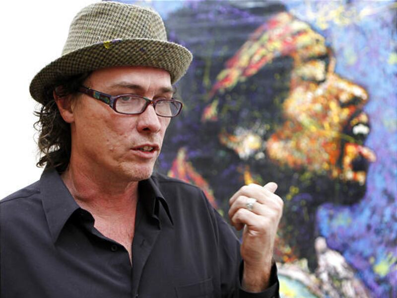 Using as many as three brushes in each hand, Dent splashed paint over sprawling canvases and himself, with subjects ranging from Jimi Hendrix to John Lennon to President Bill Clinton.