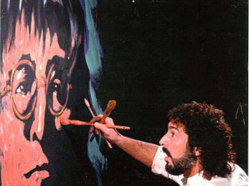 He asked if he could paint at the vigil as he would often do while hanging out with friends — on the spot, music playing, ambidextrously, talking to people. The station agreed and called him the "two-fisted art attack," a name that stuck. Dent painted two portraits of Lennon, shouting about what Lennon and his message of peace meant to him.