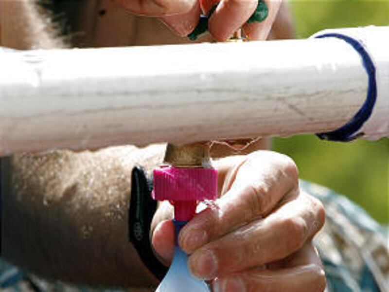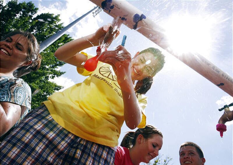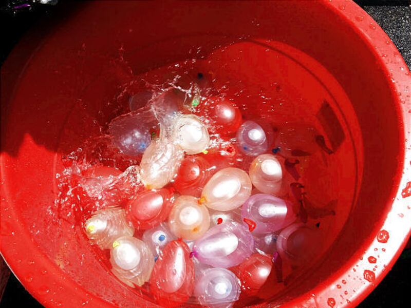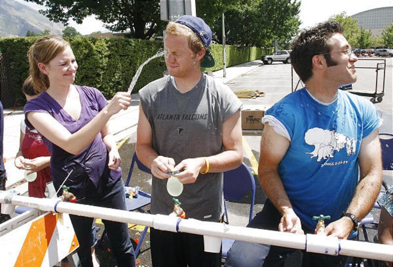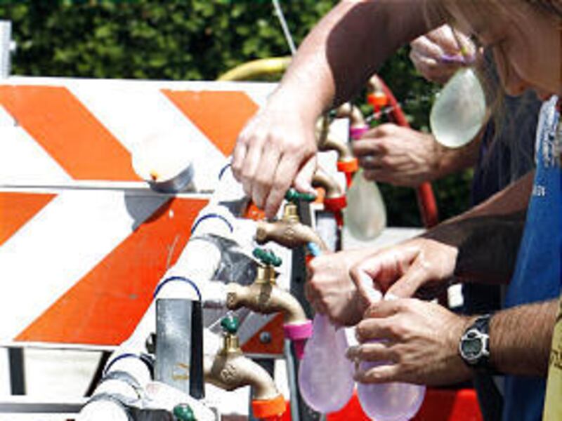 Wednesday afternoon, dozens of damp volunteers crowded around water spigots, quickly filling and tying baseball-sized balloons. Broken water balloons littered the parking lot, and "leakers" were quickly launched at friends.