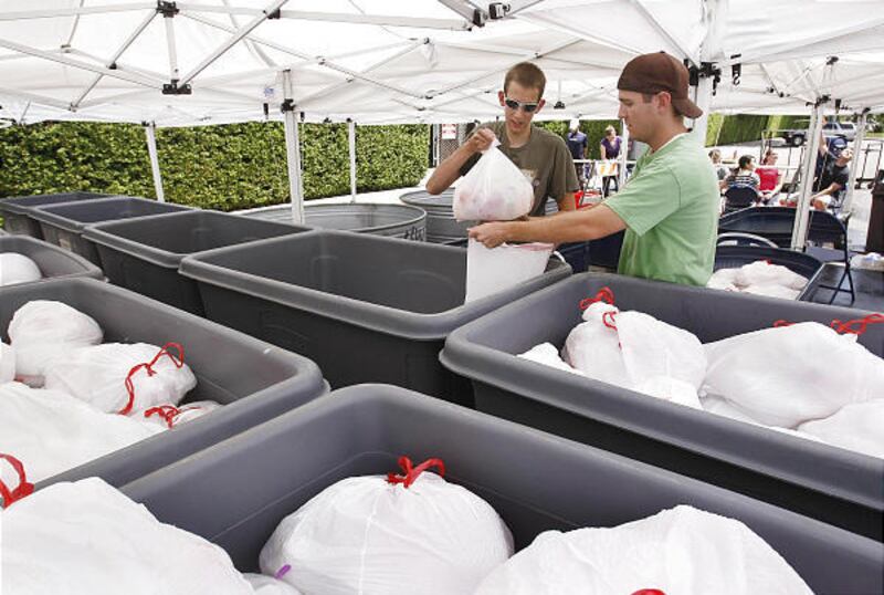Bags of 30 balloons, which will be handed to participants, were rebagged in groups of 90 and then floated in giant troughs, which normally hold ice and drinks at football games.