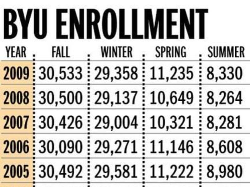 Spring and summer enrollment is usually about one-third of the normal fall/winter numbers, and in 2009, BYU reported 29,358 students during the winter semester, 11,235 in spring: 8,330 in summer and 30,533 students in fall.