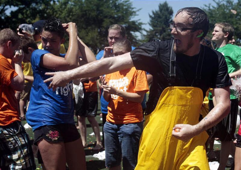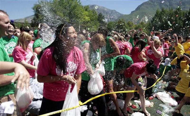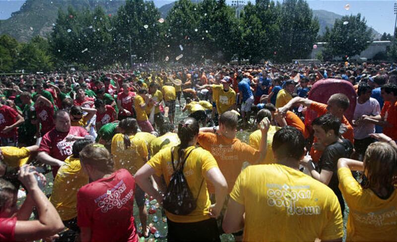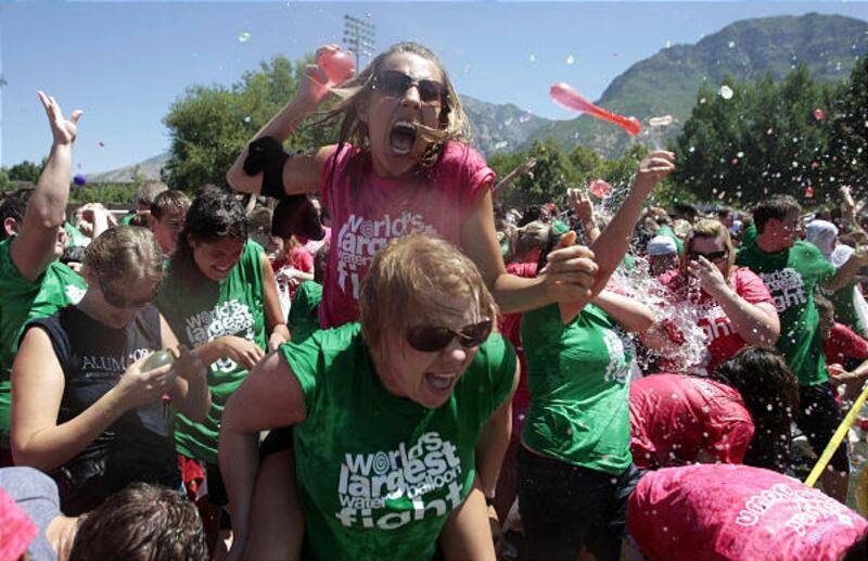 It's all-out war Friday as BYU students fling water balloons in an attempt to bust the world record for a water-balloon fight. Nearly 4,000 students tossed 120,000 balloons to drench the record set by the University of Kentucky. It took the students three days to fill the balloons and six minutes to destroy them.