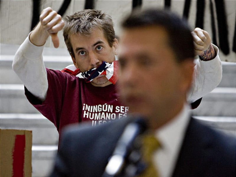 As Rep. Stephen Sandstrom entered the state Capitol rotunda to unveil his long-awaited "Arizona-style" immigration enforcement bill, about 100 protesters (most of whom were not Latino) started chanting "Shame on Sandstrom." Then they marched across the rotunda to literally surround him closely as he talked to the media, interrupting him with boos, jeers and waving signs.