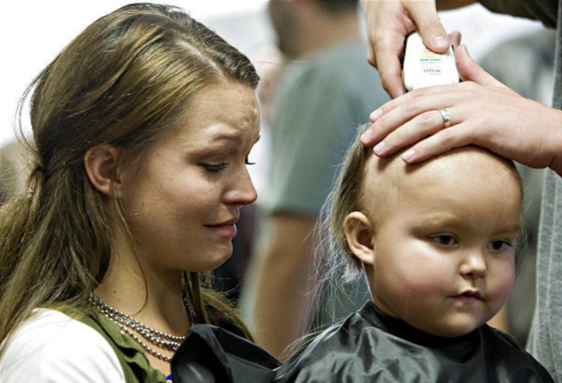Saturday's event was part fundraiser and part cheering section. Jessica Dowdy got a foot of her hair cut off for a family she doesn't even know. Jensen Moncur, 16 months old, wailed as he got his first haircut ever. A man who identified himself only as Bootay, hype man for the band Scenic Byway, got a swath of his long golden locks shaved off the top of his head, a style known as a skullet.