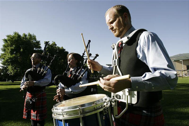"We don't mind," says Mike Postma, drum sergeant for the Wasatch & District Pipe Band. "We even tell some of them ourselves — especially we drummers!"