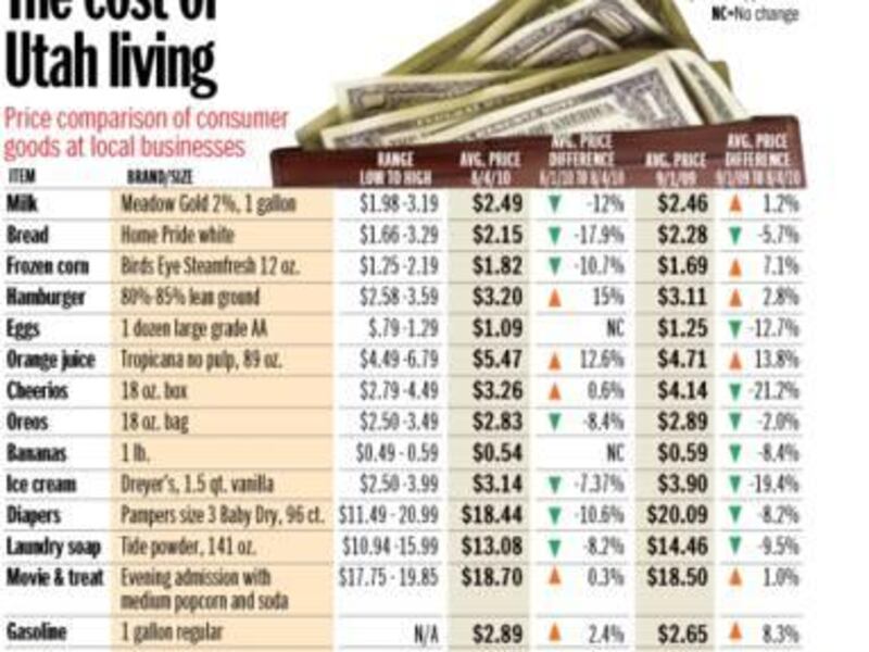 SALT LAKE CITY — Big sales on such staples as milk, bread, cereal, laundry detergent and disposable diapers were the driving force behind a reduction in the local cost of living compared to last month, and also to 2009 prices on those items.