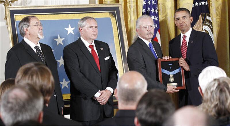 Utah State University professor Rich Etchberger of Vernal accepted the award, along with his brothers, Cory Etchberger and Stephen Wilson, on behalf of their father, Chief Master Sgt. Richard L. "Dick" Etchberger, at a ceremony in the East Room of the White House.