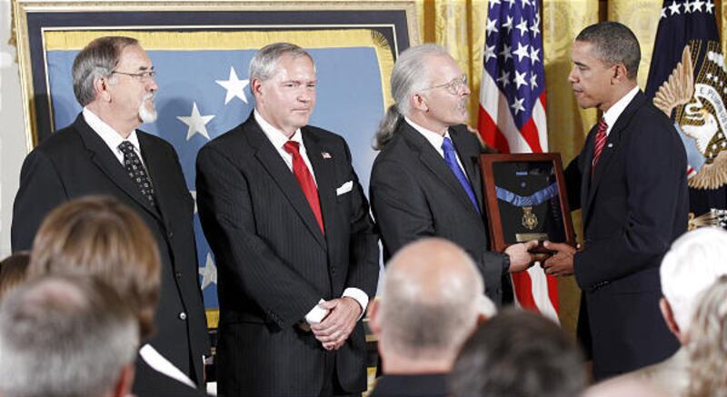 WASHINGTON — Saying it is "never too late to do the right thing," President Barack Obama presented the nation's highest military honor Tuesday to the sons of an airman who was killed in 1968 during a top secret mission in Laos.