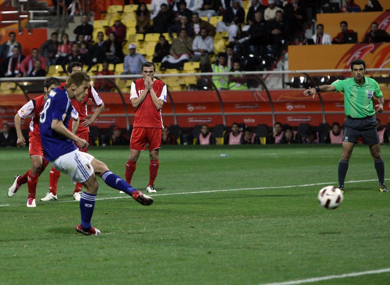 Japan goalkeeper Eiji Kawashima was sent off in the 72nd for fouling striker Sanharib Malki.