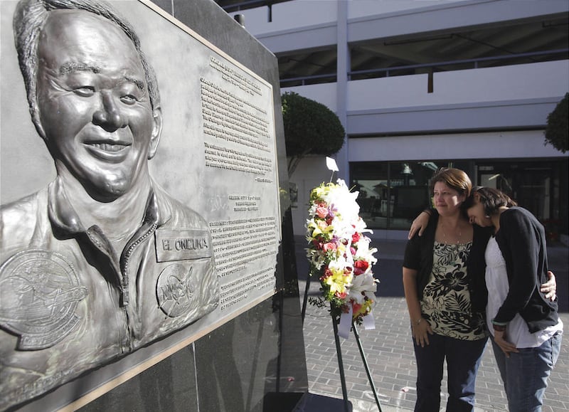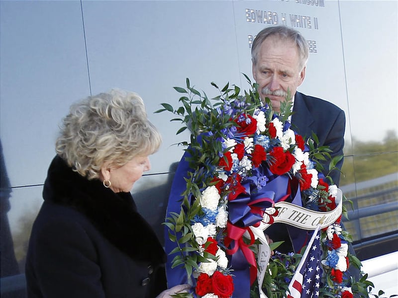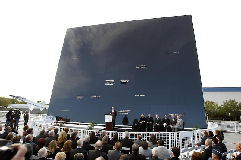 Rodgers and NASA's space operations chief, Bill Gerstenmaier, placed a memorial wreath of red, white and blue-tinted carnations at the base of the Space Mirror Memorial. The 42-foot-tall gleaming mirrored slab of granite bears the names of all 24 astronauts killed in the line of duty over the years — 17 of those in U.S. spacecraft.