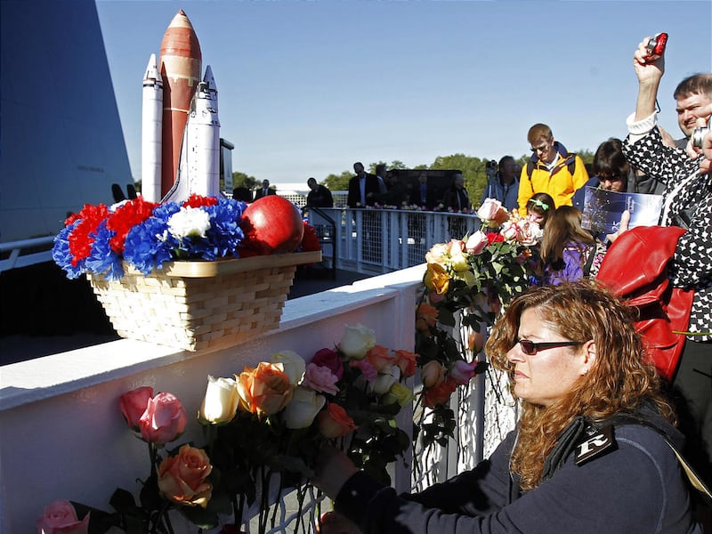 Kathryn Serene drove four hours from Savannah, Ga., in the wee hours of Friday to attend the 9 a.m. ceremony. She brought a homemade basket bearing a paper model space shuttle, red, white and blue silk flowers, and a large red apple, which she left at the base of the memorial. She was in middle school when the accident occurred, and wanted to show her respects all these years later.