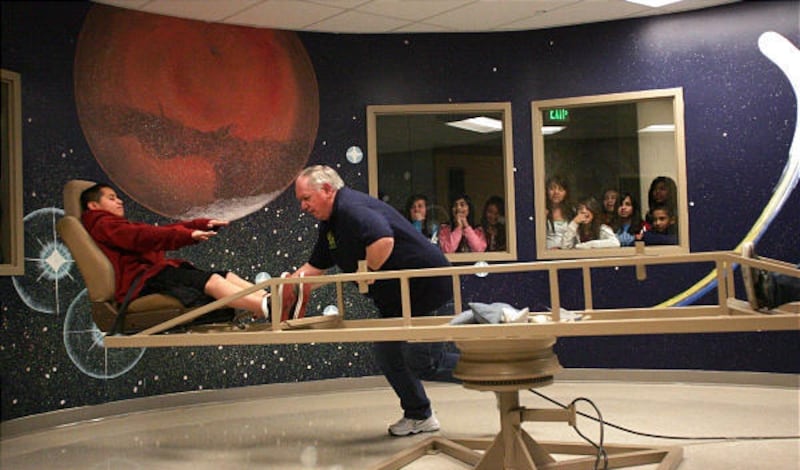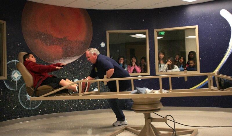 He has them sit in a chair, and then he spins them around a circular-shaped room. Students experience 3 G-Forces, which keeps them pinned to their chairs.