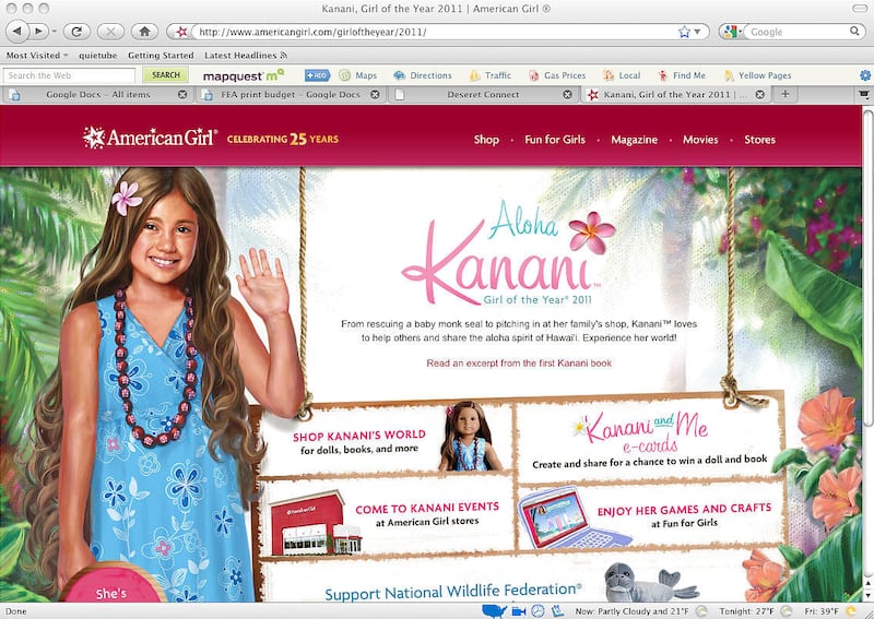 This year, American Girl is introducing a character from Hawaii — Kanani Akina. Kanani is meant to teach the "Aloha spirit." In the new books "Aloha, Kanani" and "Good Job, Kanani," young girls will see Kanani rescuing a Hawaiian monk seal, assisting older people in her community, snorkeling with sea turtles and eating shaved ice.