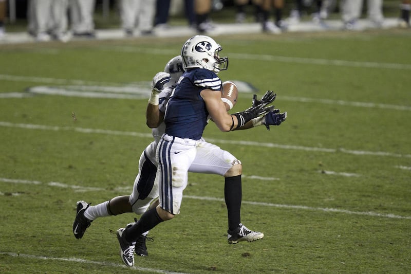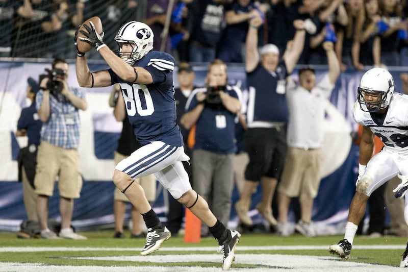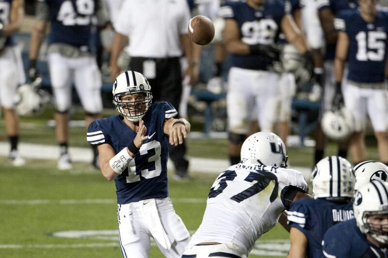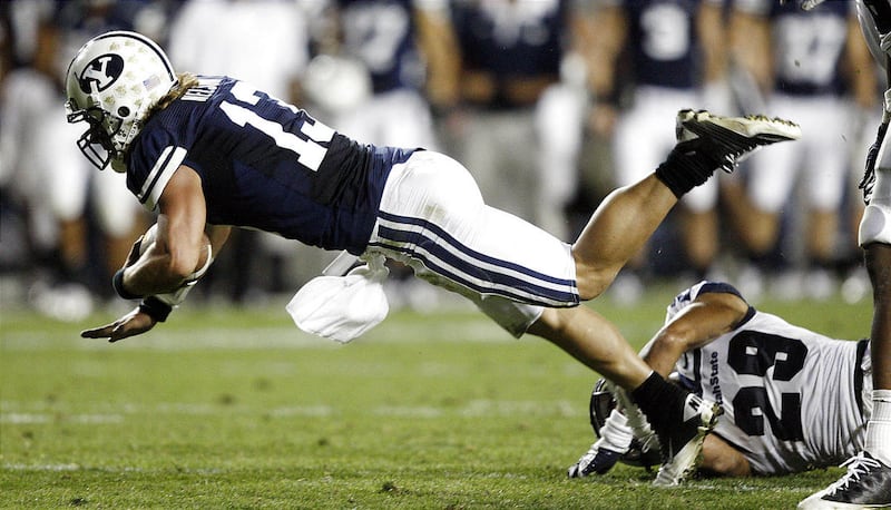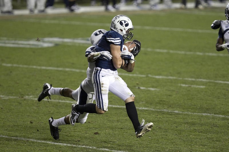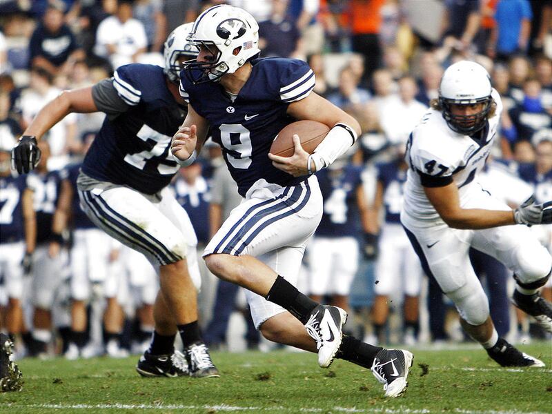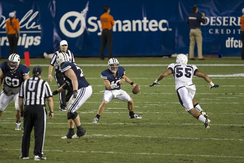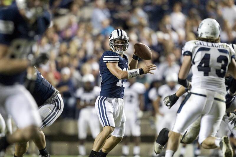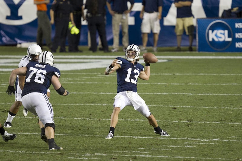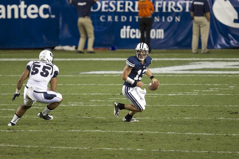 With 2:46 remaining in the game, BYU trailed 24-20 when it took over on its own 4-yard line after a 67-yard USU punt. On first down, Nelson lost two yards, giving the Cougars second-and-12 on their own 2-yard line — 98 yards from the end zone.
