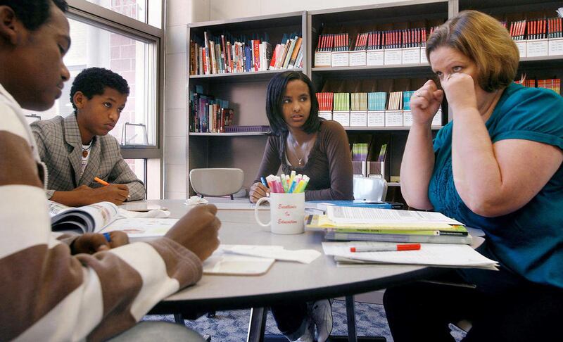 Stephanie Hagan teaches Algebra to Simret, Kibrom and Kiflom. She said they're all earning As, though their curriculum is a bit different from other students'.