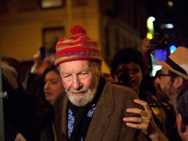 At the circle, Seeger and friends walked to the chant of "We are the 99 percent" and "We are unstoppable, another world is possible." Seeger stopped to bang a metal statue of an elephant with his cane — to cheers from the crowd.