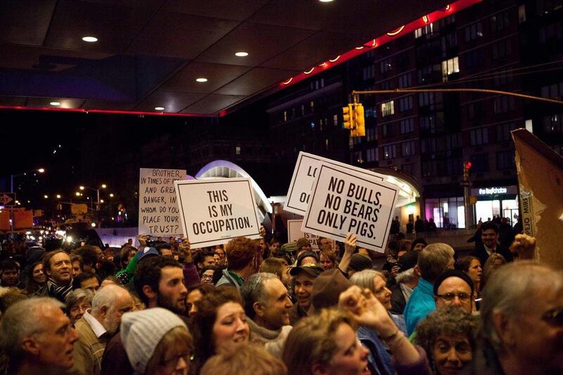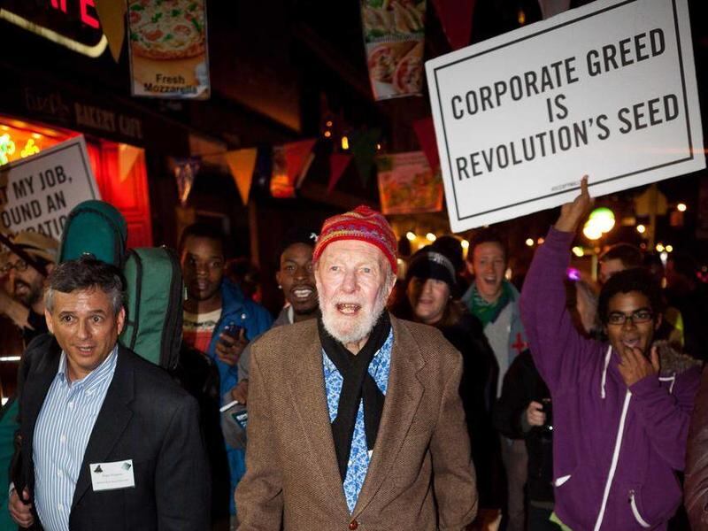 At the front of the throng, marchers held American flags and a large blue flag that said: "Revolution Generation ... Debt is Slavery." Along the way, the crowd sang protest songs made popular or written by Seeger, Woody Guthrie, and others of the protest era.