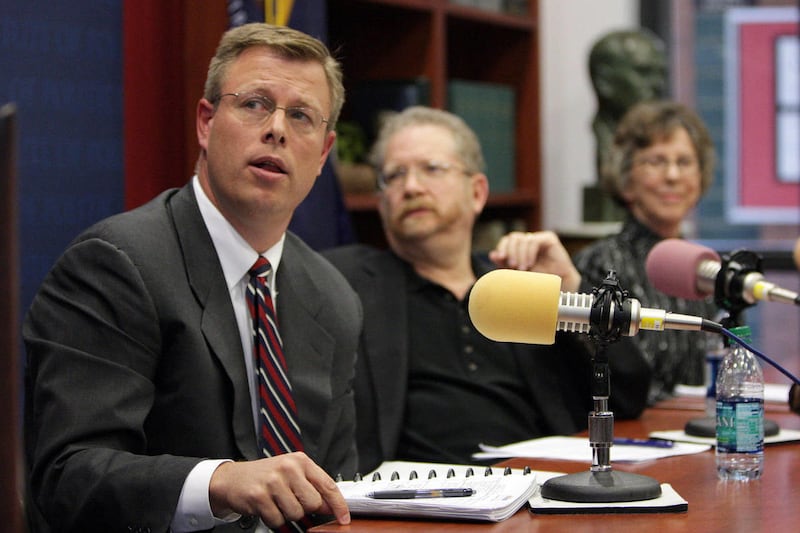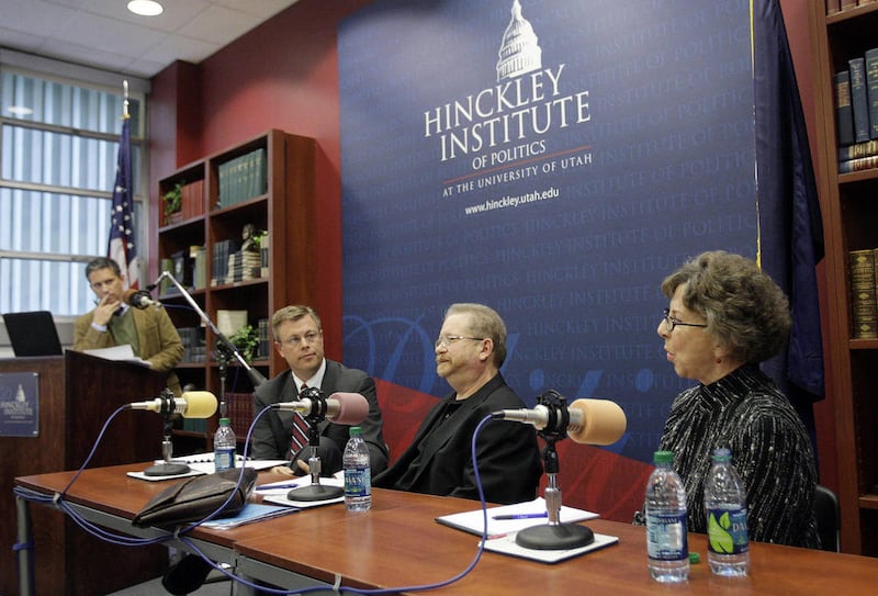 Clark Gilbert, president and CEO of Deseret News Publishing Company and Deseret Digital Media, and Nancy Conway, editor of the Salt Lake Tribune, led a panel discussion at the Hinckley Institute of Politics on Tuesday. Mark Jurkowitz, associate director of the Pew Research Center's Project for Excellence in Journalism, also rounded out the panel.