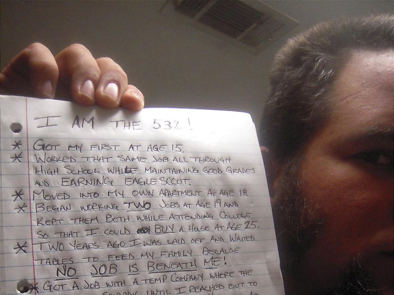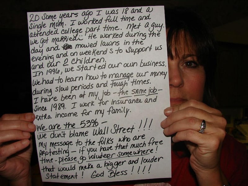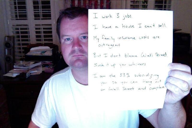 Both sites feature photos of somewhat forlorn people holding up papers explaining their troubles. The group saying "We are the 99%" blames Wall Street. Those saying "We are the 53%" blames nobody and basically says to the Occupy Wall Street crowd, "Get a job!"