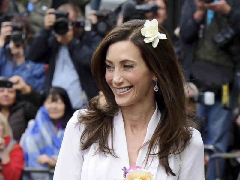 Shevell, 51, appeared radiant and composed in an elegant, ivory gown cut just above the knee. She wore a white flower in her long dark hair, and only light makeup and lipstick.