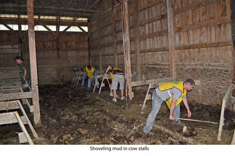 At the Engelbert Farm near Nichols, about 20 Helping Hands volunteers served. The farm is large with multiple barns and hundreds of cows. The helpers trudged through ankle-deep mud, shoveled mud out of cow stalls, unwrapped white plastic from spoiled hay bales and emptied spoiled feed bags.