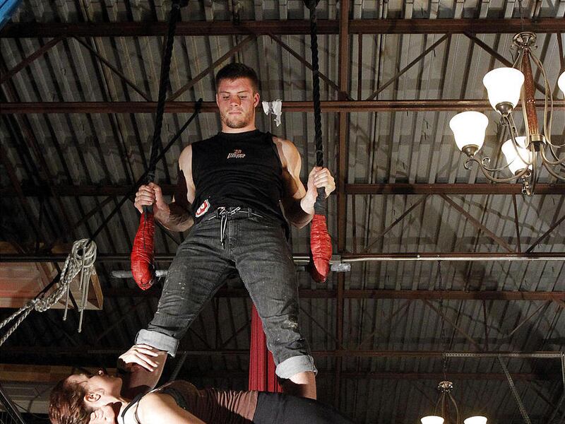 Tyce Nielsen is hanging upside down by his knees, arms stretched below. His wife, Mary, stands beneath him and jumps up to grab his hands. They bend, spin and contort their bodies. He lifts, she pulls, and within seconds, Mary is standing on top of the horizontal bar.