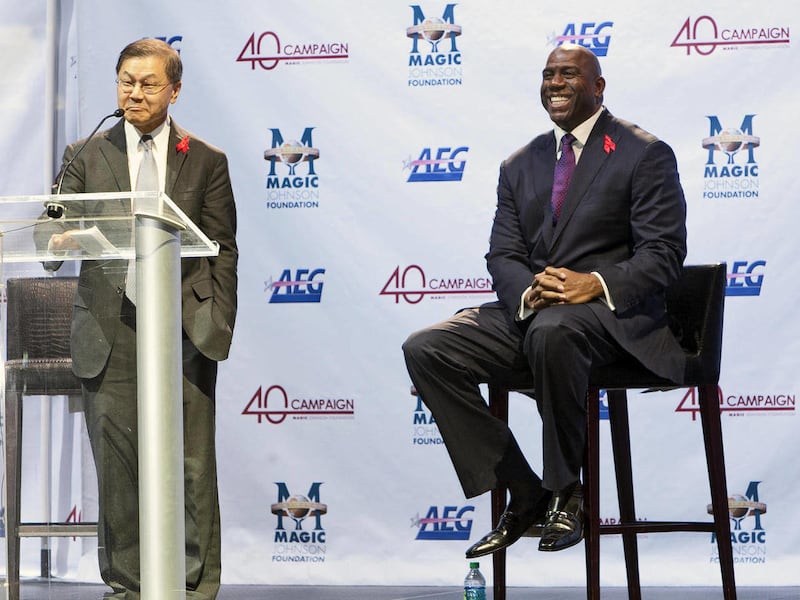 Johnson recognized the anniversary of his historic announcement at Staples Center on Monday with an upbeat celebration tinged with constant caution. Dozens of politicians, celebrities and Lakers greats joined Johnson and AIDS researcher David Ho for a luncheon after his Magic Johnson Foundation announced a $1 million gift to continue its mission for worldwide HIV awareness and testing.