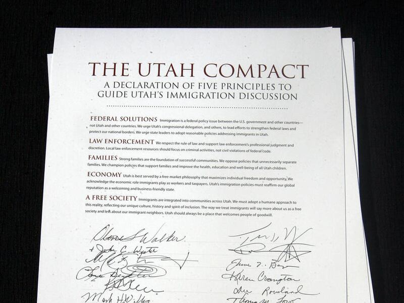 The compact, signed Nov. 11, 2010, outlined principles to guide the immigration debate, urging federal solutions and policies that did not separate families. Some 4,500 people have signed the document online at theutahcompact.com in the past year.