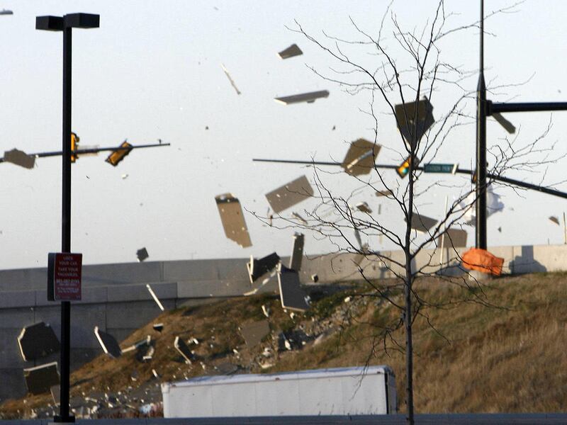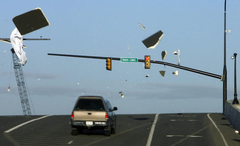 In Centerville, where city officials declared a state of emergency, several motorists were pelted on Parrish Lane with debris from damaged buildings and signs.