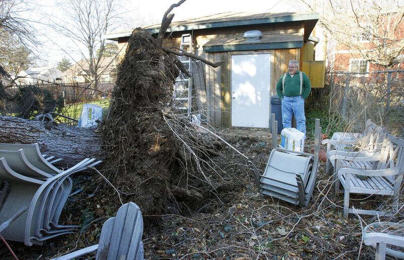 Farther east, wind-caused damage to a home on Gordon Avenue was attracting a crowd. Two 50-year-old Japanese pine trees succumbed to the wind and toppled onto the house. Their extensive root systems peeled up a section of the driveway and caused damage to the sidewalk.