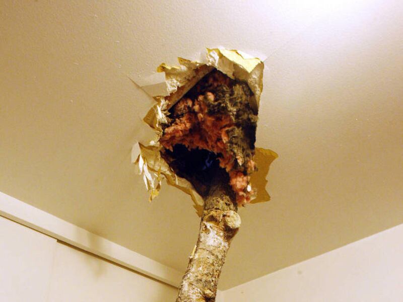 The homeowners, Shan and Sandra Stott, were in good spirits despite being unable to get out of their front door. Their shiny black Infiniti also was covered by a pine tree.