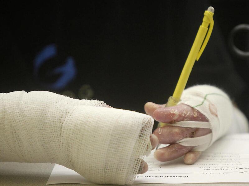 Taking a bath and changing his bandages mean several hours of pain a day.