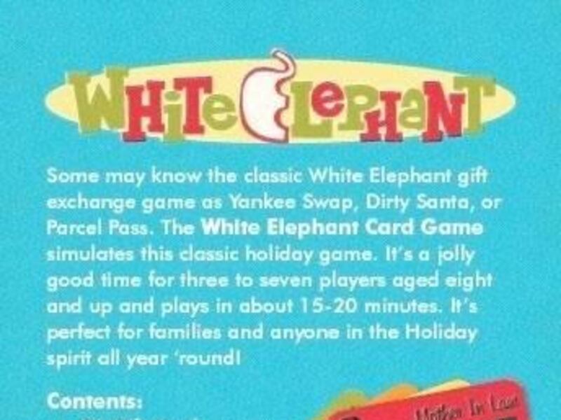 In White Elephant the Card Game, players receive a goal card listing three of five gift categories: Crazy Neighbor, Mother-in-Law, Fluffy the Cat, Random Stranger and Great Uncle Irwin. The goal is to collect the highest point-value cards in the categories on your goal card to win. A deck of 50 gift cards contains funny retro gifts from five categories. Each category contains a set of 10 cards valued from one to 10.