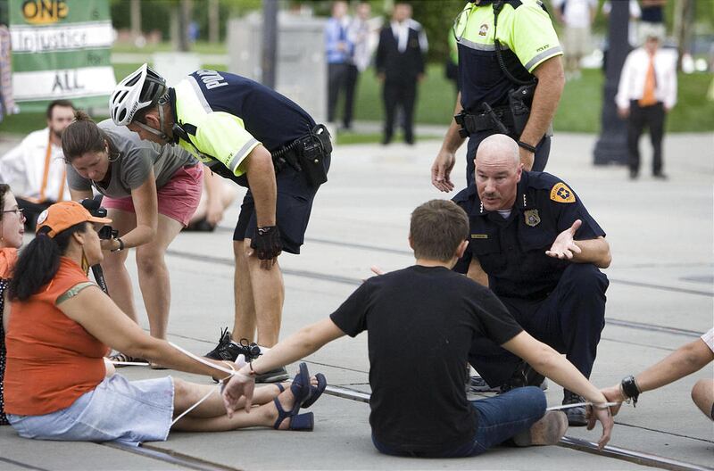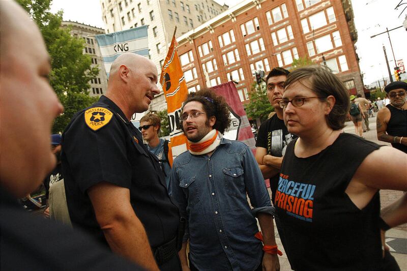 It was a repeat of a similar scenario in July when people blocked traffic — including TRAX trains — while protesting the sentencing of environmental activist Tim DeChristopher outside the federal courthouse on Main Street. A total of 26 people were arrested. But the next day, both sides — even those arrested — gave praise to the other for the cordial way the situation was handled.