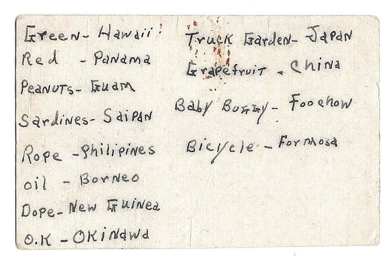 If my father used the word "green" in the next-to-last paragraph of his letter home, it meant his ship was in Hawaii. If he wrote "OK," he was in Okinawa. Truck garden would mean Japan.