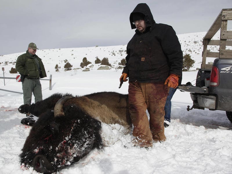 Jim Marsh immediately jumped out of his truck, pushed several feet through deep snow and took aim. The bison took several shots to go down, and Francis hiked to the animal to deliver one final shot.