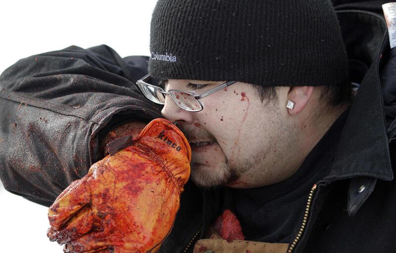 All six men and wildlife program manager Carl Scheeler, who helped get the hunts approved, pitched in for the grueling task of butchering and skinning the animal. They carved with knives, sharpening and resharpening them. Three boys with the hunting party played in the snow, stopping every so often to watch the men at work.