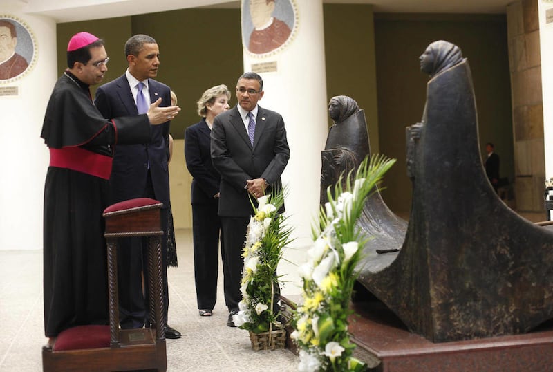 Obama toured the national cathedral with Monsignor Jose Luis Escobar Alas, the current archbishop, and paid respects to a man ordered killed 31 years ago by an official in El Salvador's U.S.-backed army.