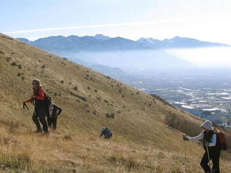 In Salt Lake County: There's the Bonneville Shoreline Trail, which will someday stretch from Idaho to Nephi, roughly 280 miles. It runs along the eastern bench of the valley. The trail follows closely the shoreline of old Lake Bonneville, which once covered most of Utah.